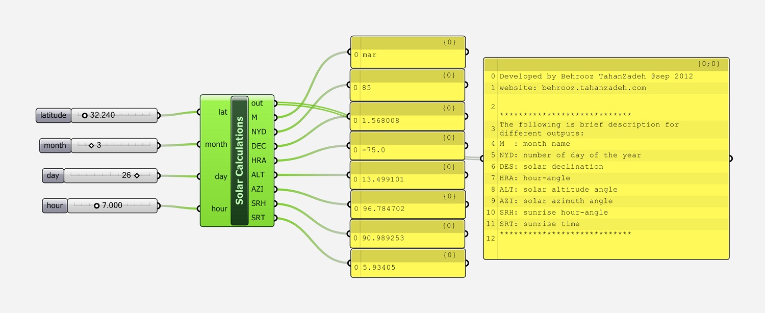 This is my first experience as a grasshopper developer. I create a simple component called "Solar Calculations" that do all of the basic calculations to get sun properties at specific location, in a specific time.